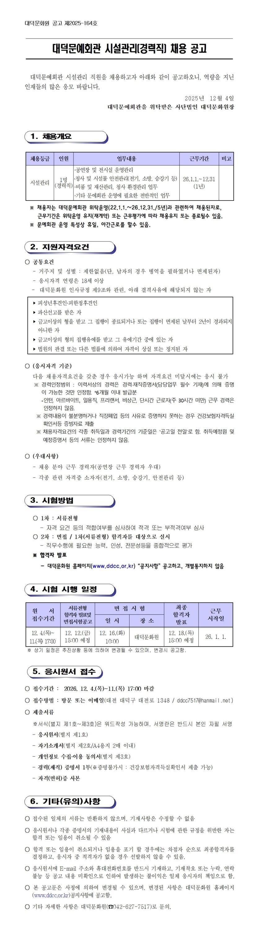 대덕문예회관 시설관리(경력직) 채용 공고